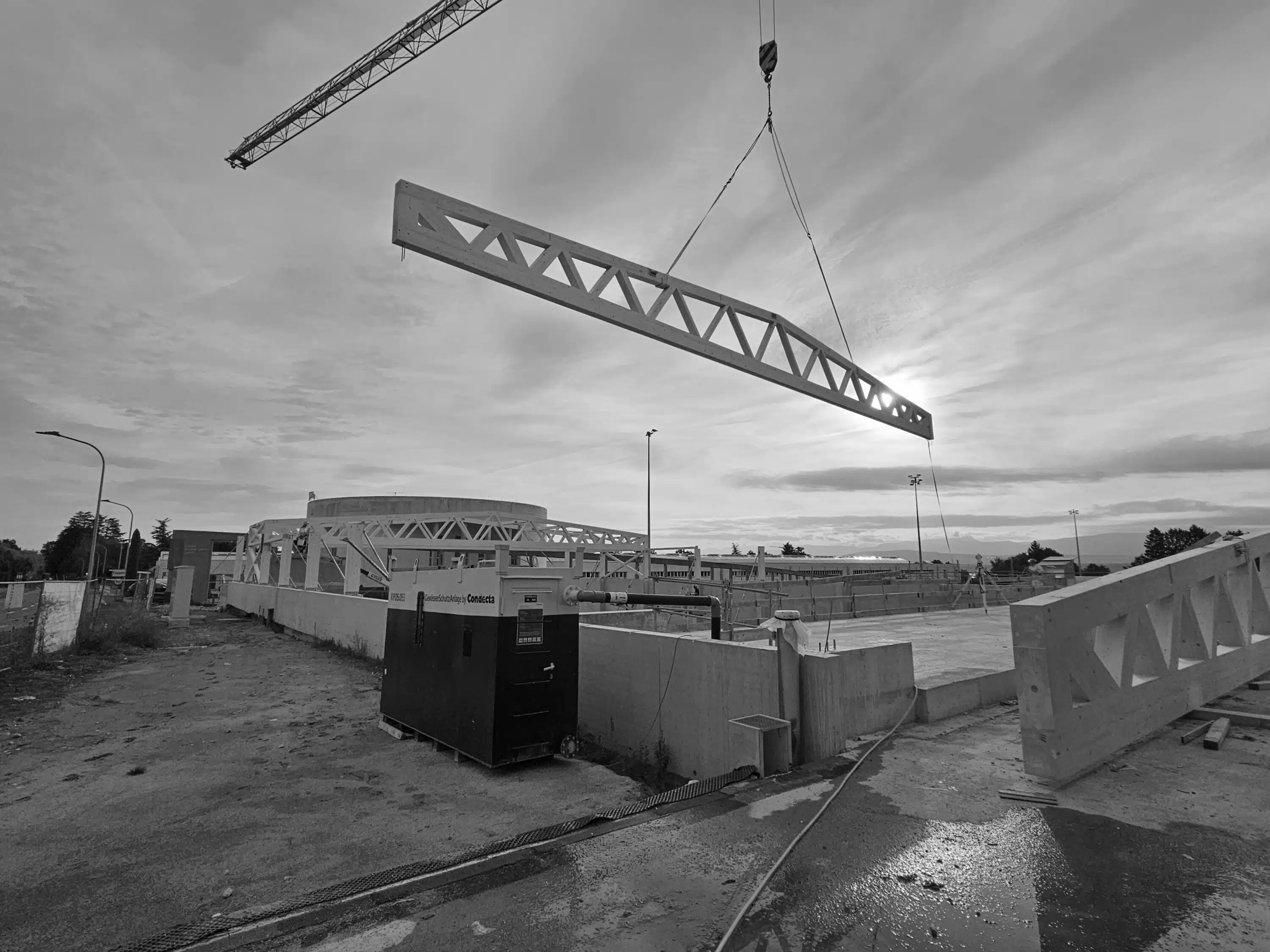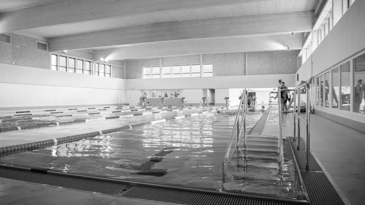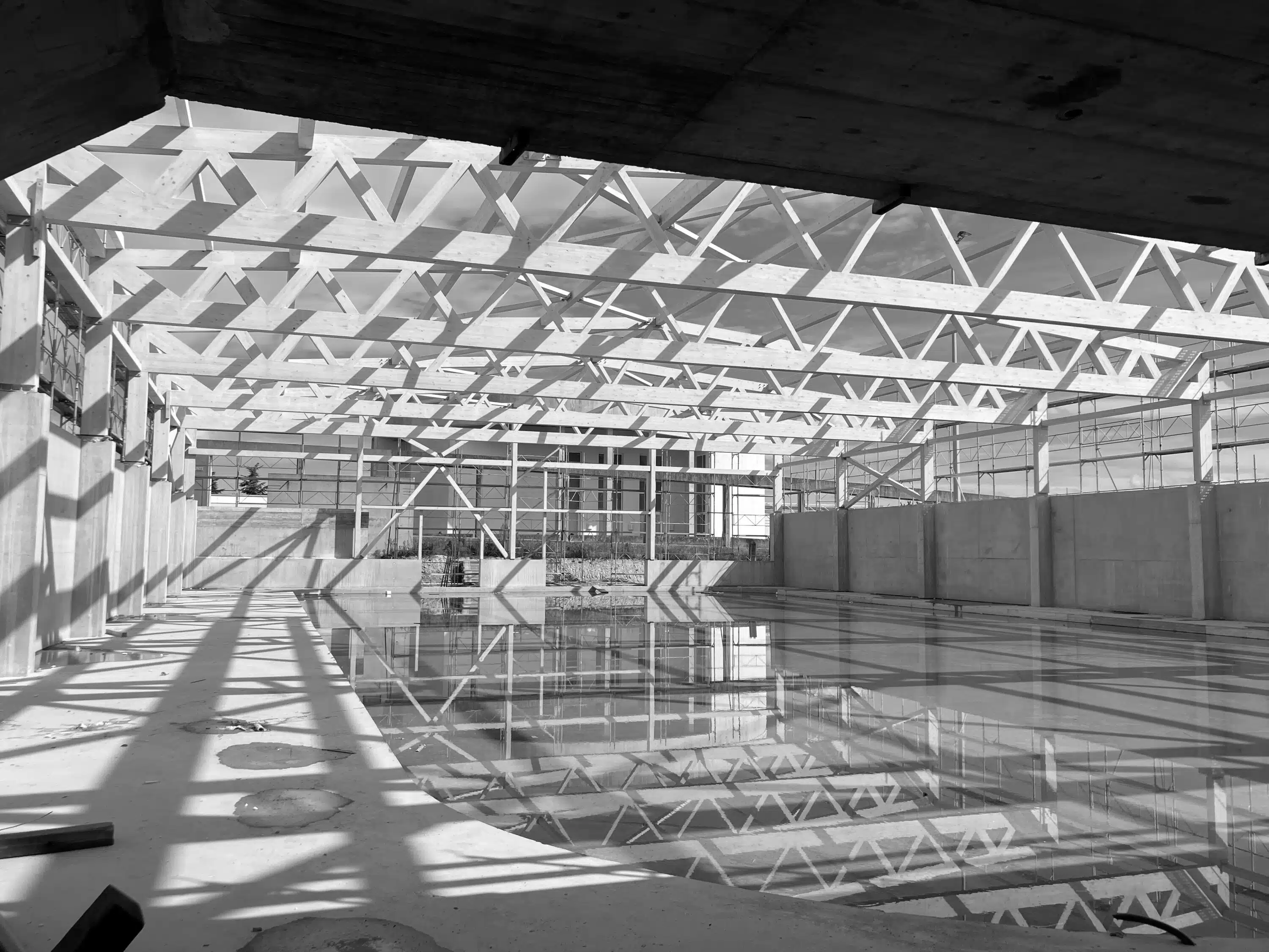 Création d’un complexe comprenant une piscine composée d’un bassin de 25m et d’un bassin d’apprentissage, d’une patinoire, d’un restaurant et d’un bâtiment administratif. Les structures au sol sont en béton armé, alors que les ossatures des couvertures de la zone piscine et de la zone patinoire sont réalisées en charpente en bois.